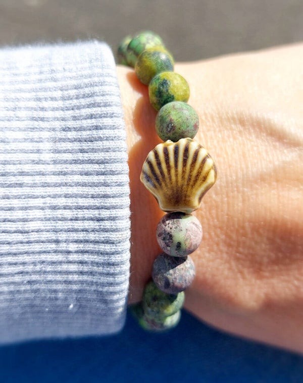 Een kralenarmband in prachtige groene tinten van 8 mm natuurstenen en een keramiek kraal. Geregen op licht elastisch transparante draad voor een goede pasvorm.
