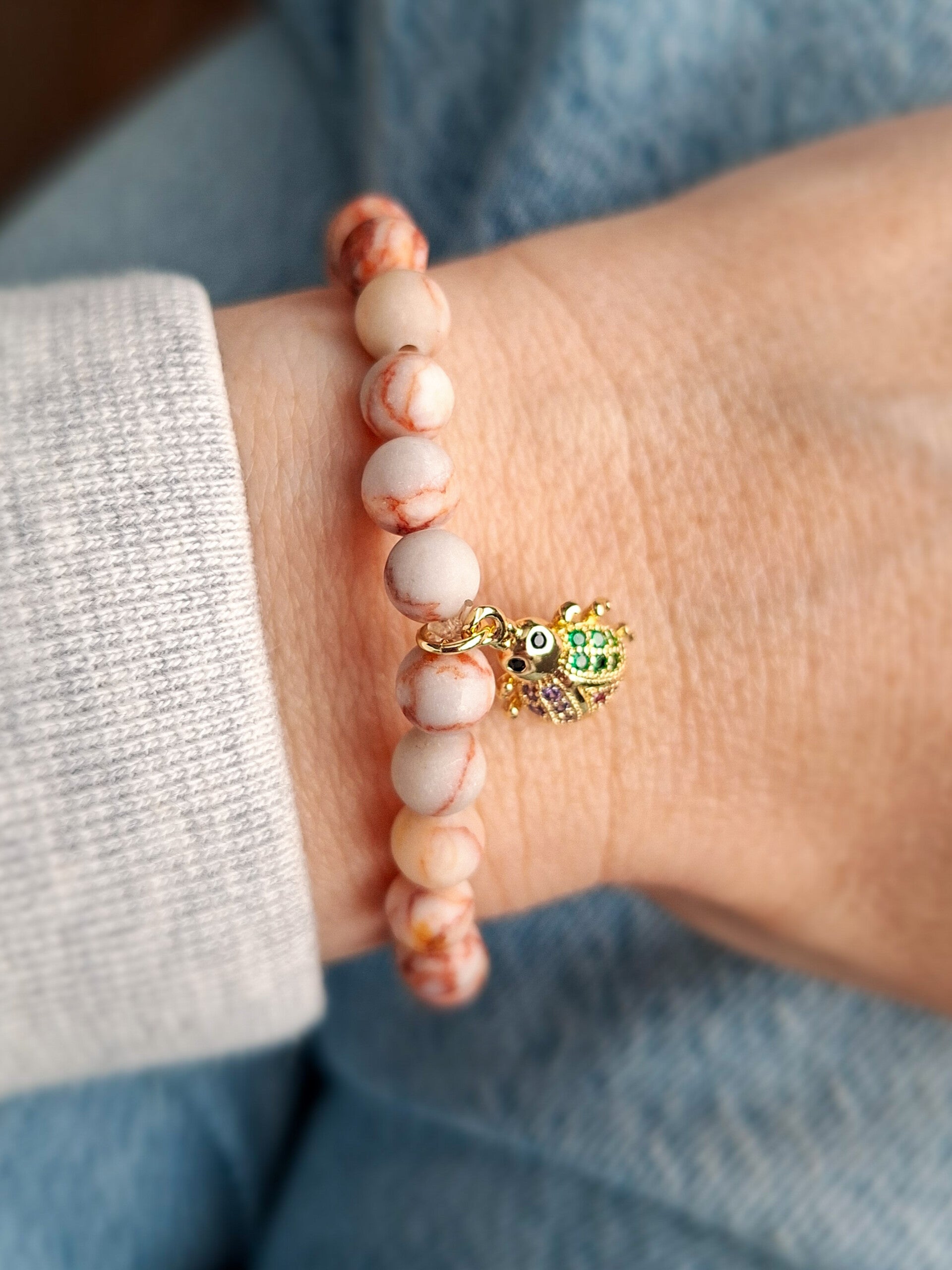 Een prachtige armband gemaakt van natuurstenen kralen en een goudkleurig bedeltje. Dankzij het transparante elastische draad vormt hij zich perfect om je pols.